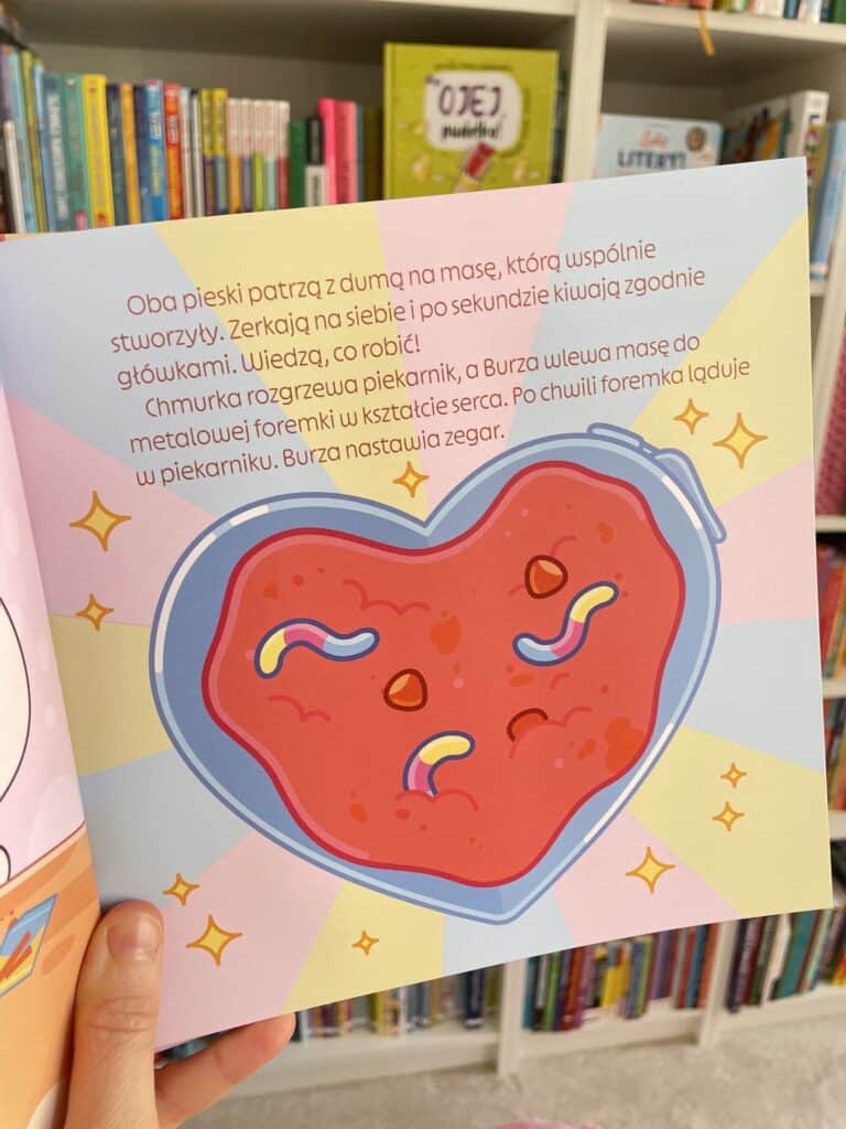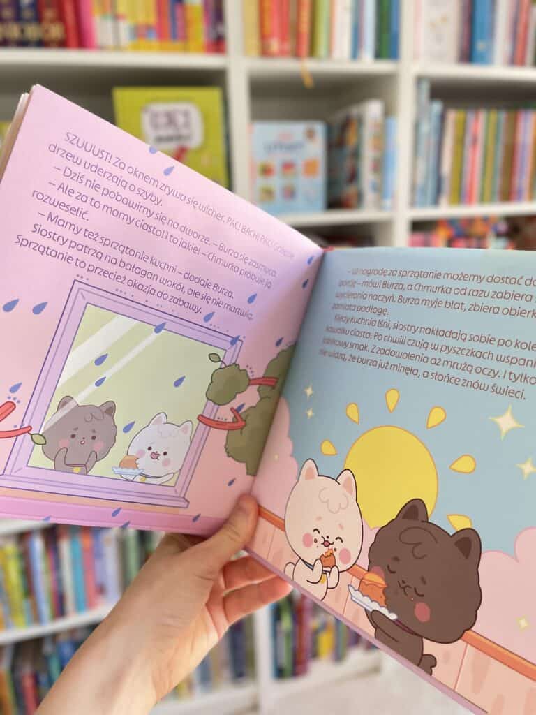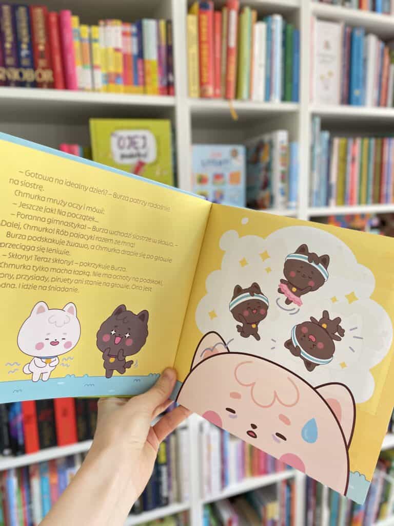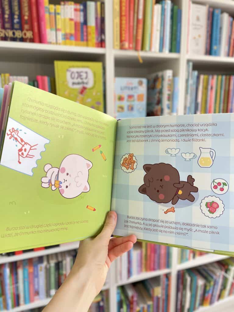 Swoją droga, trochę mi się to kojarzy z Bluey, może to będzie taka nasza rodzima wersja wesołego, psiego rodzeństwa. Co myślisz? Chmurka i Burza są urocze, choć zupełnie różne i to widać w książkach. Tu dzień może się zacząć uśmiechem, słońcem i świetnym pomysłem, a zakończyć burzą. Ale spokojnie, po niej na pewno w końcu zaświeci słońce, czyli klasyczne zabawy rodzeństwa.
