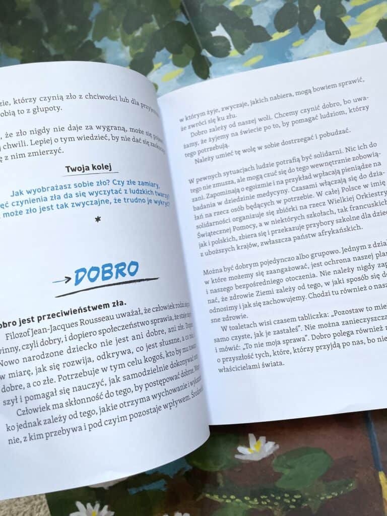 Czy można filozofować o dobru i złu? Jak najbardziej, to podstawy, ale tu mamy też nudę, ciszę i hałas, narcyzm, przyjaźń, strach, sny, przemoc, korupcję, a nawet abstrakcję. I to jest piękne, bo dzieci nie boją się pytać, a ta książka daje im przestrzeń, by te pytania wybrzmiały. To świetne narzędzie do rozwijania myślenia krytycznego, wrażliwości i uważności, czyli rzeczy, których młodzi ludzie naprawdę potrzebują. Zresztą dorośli też.