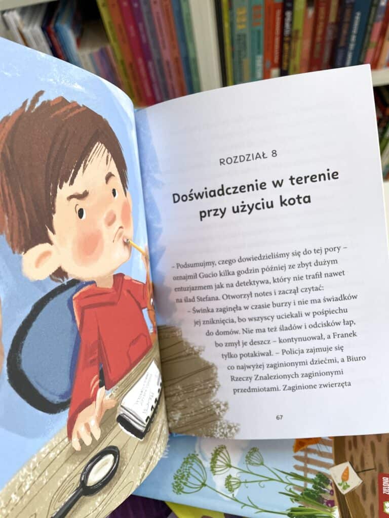 Tak naprawdę to nie świnki a kawii domowej, to szczegół dokładnie omówiony w książce. Właśnie szczegóły bardzo interesują Gucia, który ma świetną pamięć, bystre oko i lubi skupiać się na detalach. To sprawia, że świetnie czuje się w roli detektywa i wciela się w nią, gdy kawia jego najlepszego przyjaciela ginie w tajemniczych okolicznościach.