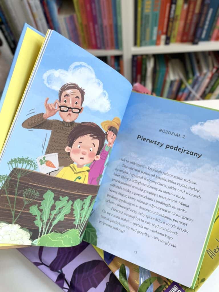 Z warzywnego ogródka mamy zniknęły marchewki, Gucio rozpoczyna śledztwo. Podejrzani są wszyscy, nawet mięczaki ślimaki i przez chwilę tata z buzią usmarowaną borówkami. I tu znowu okazja do łyknięcia odrobiny wiadomości przyrodniczych o ogrodowych szkodnikach i ich wrogach. Doceniam piękne ilustracje Oli Makowskiej, bo dzięki nim te przygody są wesołe i takie bezpretensjonalne.