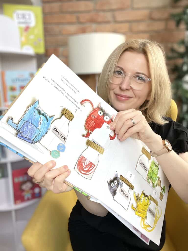 Zobaczcie, jak genialnie to jest rozwiązane, bo każda emocja trafia do swojego słoiczka. Można je otwierać, zajrzeć do środka, dotknąć. To uporządkowanie chaosu związanego z emocjami w formie, którą dzieci naprawdę rozumieją i zapamiętują.