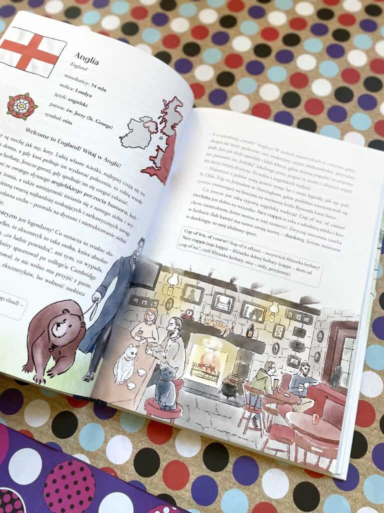 Jedną z pierwszych rzeczy, które Archibald pomaga zrozumieć, jest to, że Wielka Brytania to nie tylko Anglia. Wyjaśnia bardzo klarownie, że mamy tu do czynienia z czterema różnymi krajami, które razem tworzą jedno państwo: Anglię, Szkocję, Walię i Irlandię Północną. Każdy z nich ma swoje tradycje, symbole, legendy i języki. I co ważne, w książce wszystkie są traktowane z równą uwagą. Dzieci uczą się więc, że jedna nazwa kryje różnorodność kultur. To świetny wstęp do rozmów o świecie, tożsamości i tym, jak pięknie można się różnić.