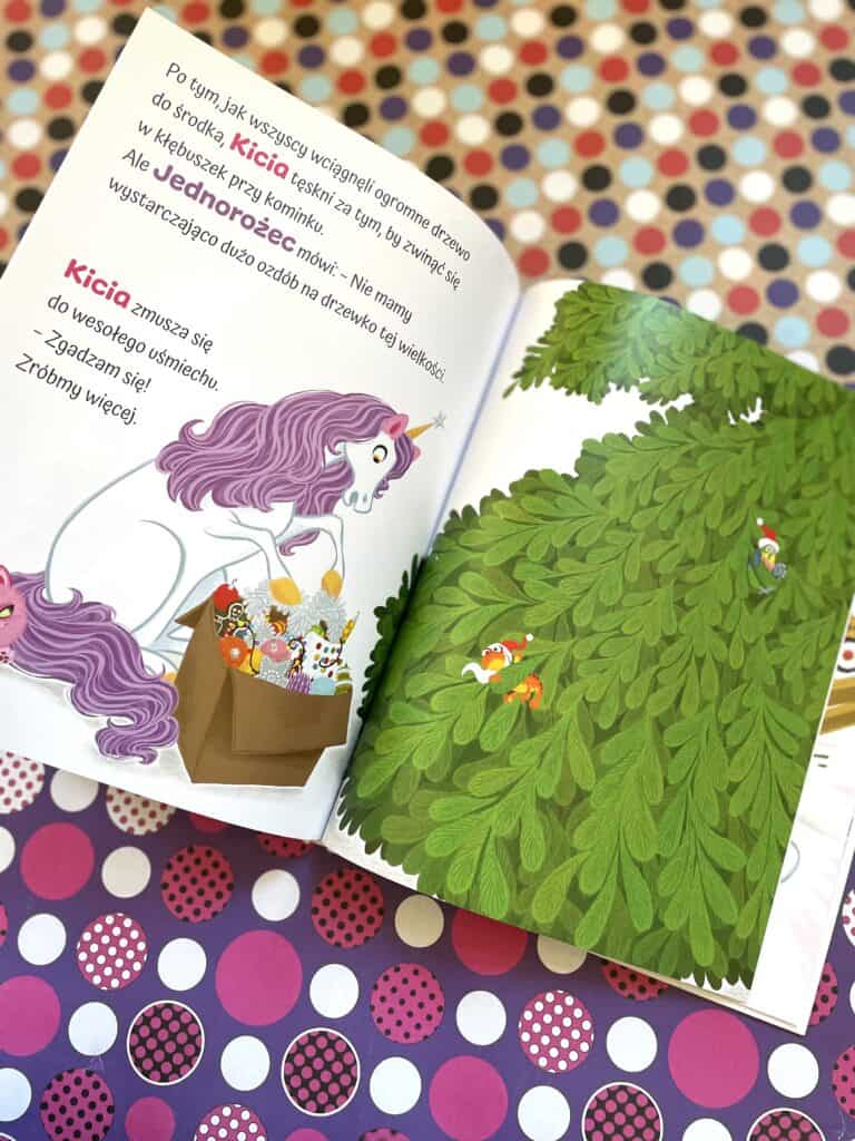 Wiecie, co jeszcze mi się podoba? To, że każda strona kipi kolorami, a mimika bohaterów sprawia, że dzieci od razu wiedzą, co czują Kicia i Jednorożec. Książka jest dynamiczna, pełna energii i świątecznej radości, ale nie brakuje w niej także chwil refleksji.