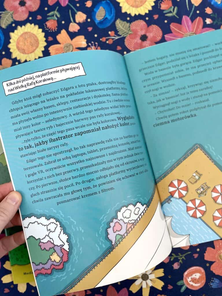 Dokładnie tak samo jest w historii pt. „Znikające kolory rafy”. Tym razem Edgar wyjeżdża na wakacje i zabiera ze sobą swojego robota.