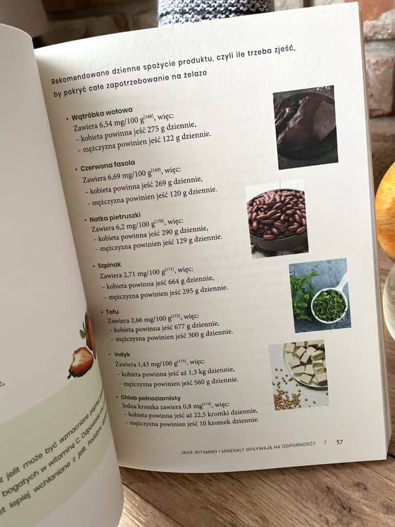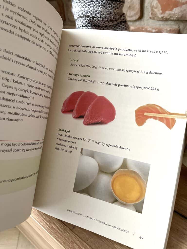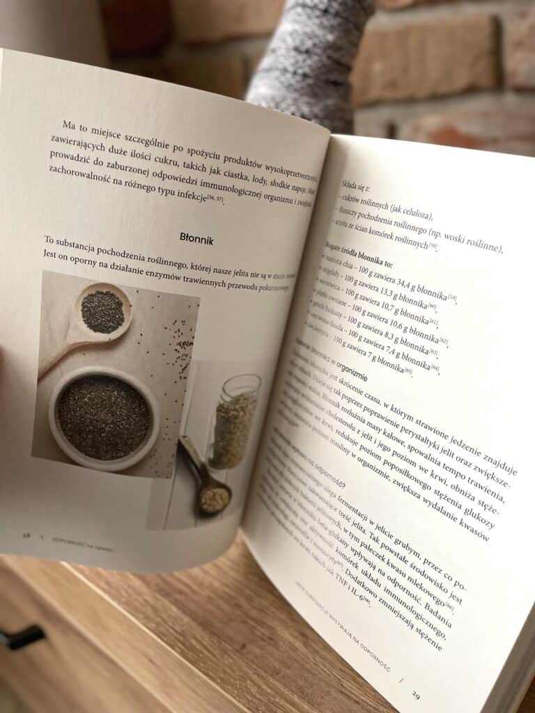 Autorka dokładnie omawia, jakich składników potrzebuje układ odpornościowy, od białka, tłuszczów, witamin i minerałów po błonnik wpływający na mikro biotę jelitową. Wyjaśnia, że suplementy i leki to tylko uzupełnienie, a nie zastępstwo codziennej diety.