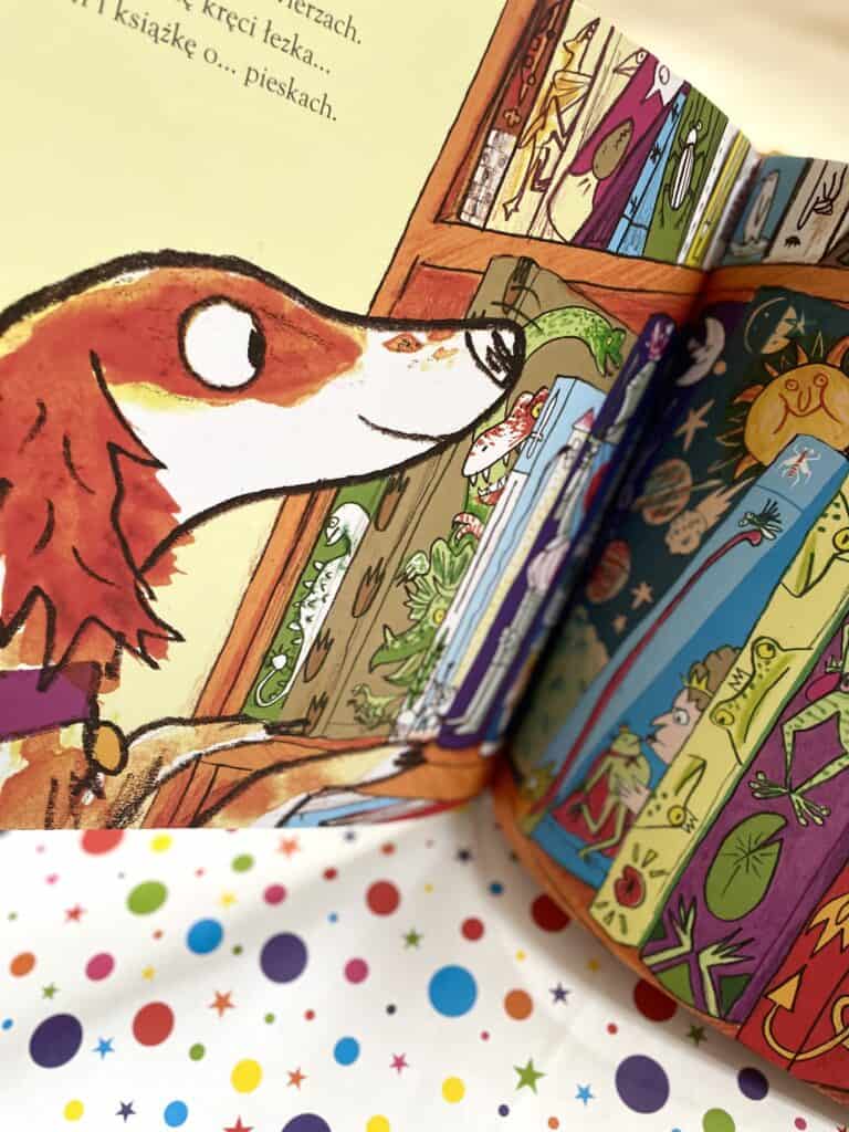 I tu pojawia się najpiękniejszy moment, bo pies nie tylko rozwiązuje zagadkę, ale też prowadzi wszystkich do miejsca, gdzie książek jest pełno i można je czytać zupełnie za darmo. Tak, idziemy do biblioteki!