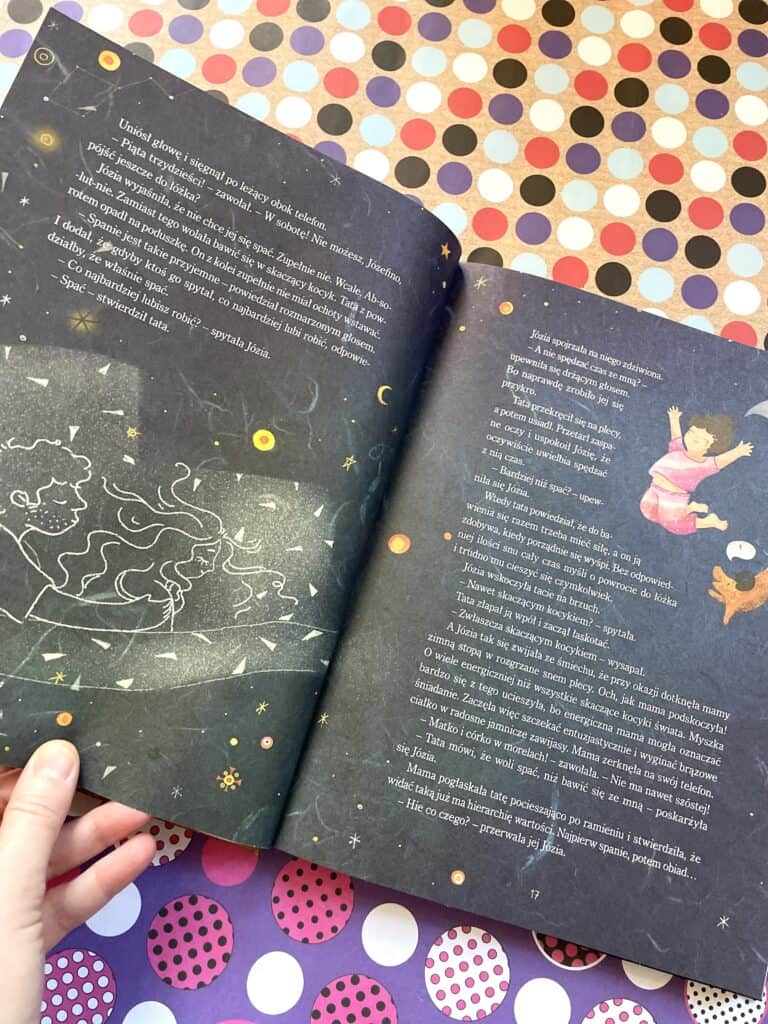 Na końcu każdego rozdziału są pytania do dzieci, właśnie po to, by pojawiały się rozmowy na ważne tematy. Jakie? Szczerość, odpowiedzialność, uczciwość, solidarność, wolność, odwaga, prawda, pracowitość i odpoczynek, różnorodność, troska, życzliwość. Tematy się nigdy nie kończą, a opowieści w tej książce otwierają głowę na różne sytuacje.