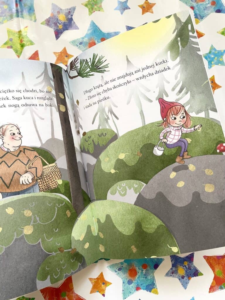 Warto też wspomnieć o dziadkach i babciach, bo ta książka bardzo ciekawie pokazuje ich perspektywę. Dziadek Sagi nie jest kimś, kto po prostu psuje dziecko dla zabawy. On się stara, planuje grzybobranie, rozumie tęsknotę wnuczki i daje jej przestrzeń, żeby powiedziała, czego potrzebuje. On widzi, że Saga się denerwuje nocowanką, ale nie dramatyzuje, nie stawia wszystkiego na głowie.