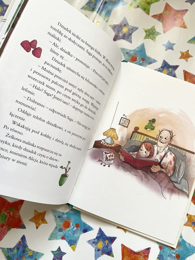 Podoba mi się scena, w której książka uczy, że można powiedzieć, czego się potrzebuje. Saga wprost mówi dziadkowi, że chce spać razem z nim, choć on zaplanował to inaczej. Mała zadbała tu o swoje emocje i poczucie bezpieczeństwa przy bliskiej osobie.