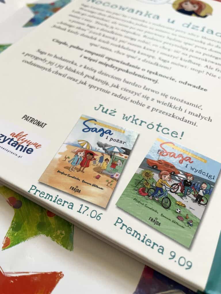 Saga i nocowanka” (Wydawnictwo Frajda) to pierwsza część serii „Saga z ulicy Słonecznikowej” dla dzieci samodzielnie czytających, czyli mniej więcej od 6-7 roku życia. Historia o tym, jak mała Saga przeżywa swoje pierwsze nocowanie u dziadka. Patronat Aktywne Czytanie.