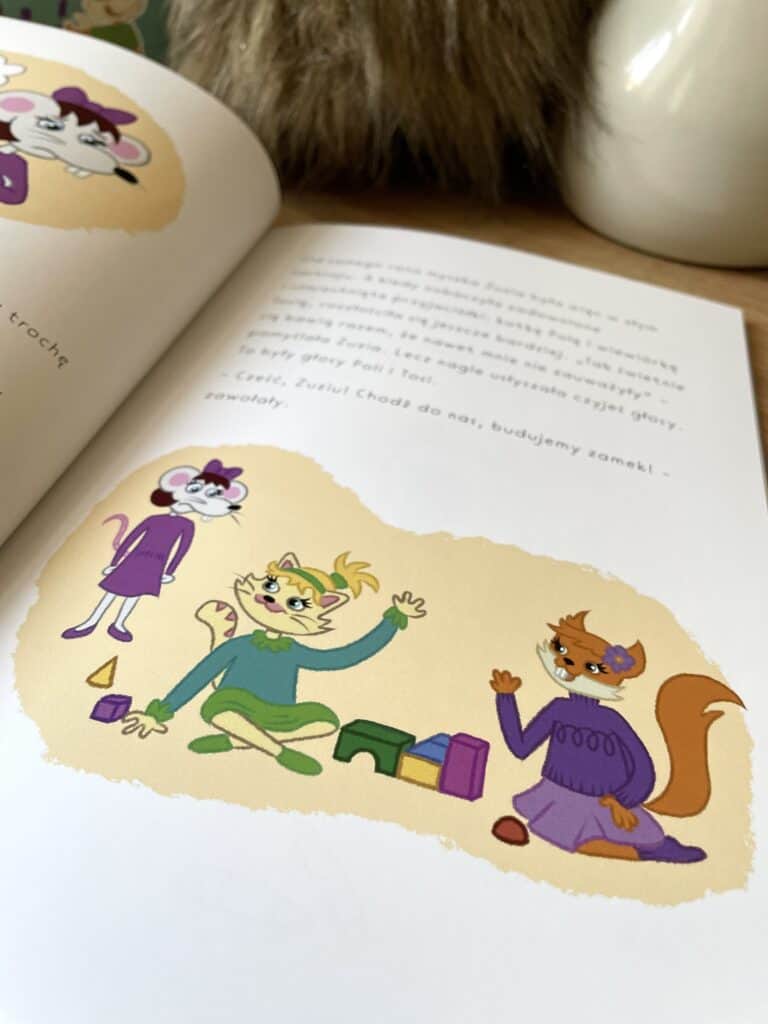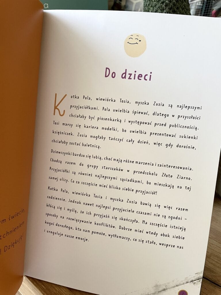 Ta książka trafi do dzieci, które mają za sobą pierwszą poważną kłótnię z przyjacielem. I do tych, które taką kłótnię mają dopiero przed sobą, bo przecież to nieuniknione. Trzy bohaterki to postaci zwierzęce, co czasem pomaga dzieciom zdystansować się od własnych emocji i spojrzeć na sytuację z boku, bez wstydu. Jak one na pacynki podczas zajęć.