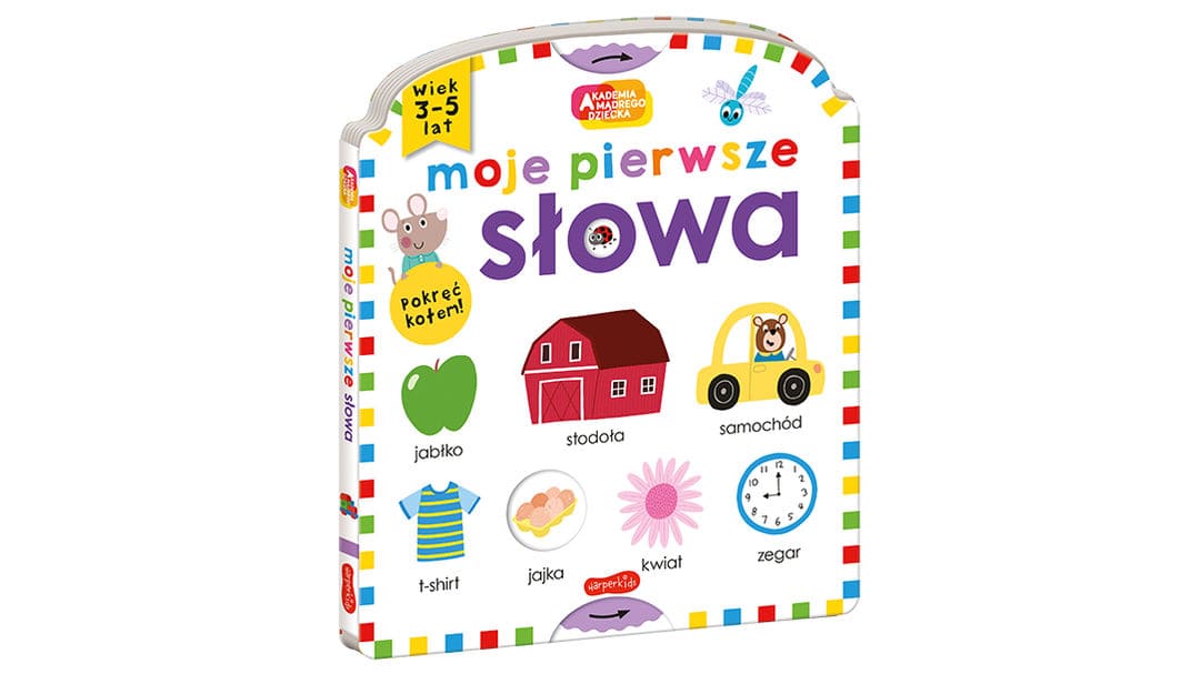 Moje pierwsze słowa Akademii Mądrego Dziecka to kolejna pozycja z serii moje pierwsze od wydawcy HarperKids. Tym razem książeczka zachęca do poznawania nowych, prostych słów. Każda rozkładówka to minimum siedem nowych słów zobrazowanych dużym, kolorowym rysunkiem. Każdy przedstawiony przedmiot jest podpisany, co ułatwia przyswajanie pierwszych słów oraz dodatkowo oswaja dziecko z literkami.