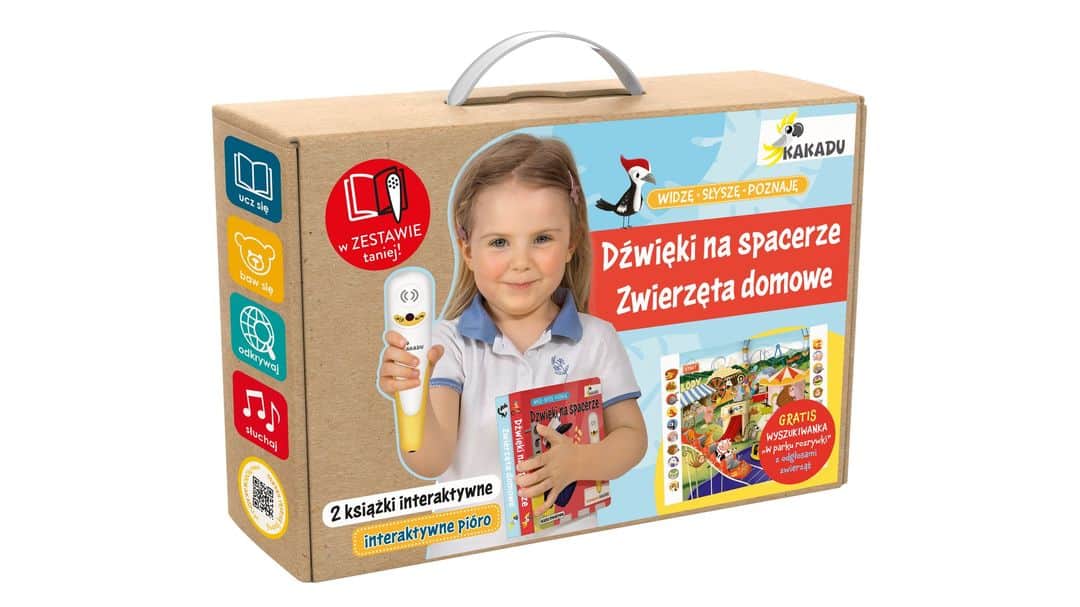 Zwierzęta domowe i Dźwięki na spacerze to książki interaktywne z piórem Kakadu, które uruchamia zakodowane na stronach teksty i dźwięki. Publikacje są częścią innowacyjnego systemu nauki i zabawy w jednym.