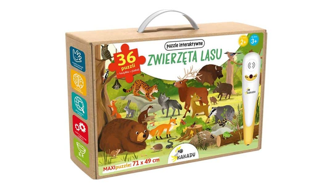 Zwierzęta lasu to NOWOŚĆ na rynku publikacji interaktywnych! Puzzle interaktywne współpracują z piórem Kakadu, które uruchamia zakodowane na nich teksty i dźwięki. Puzzle są częścią innowacyjnego systemu nauki i zabawy w jednym.
